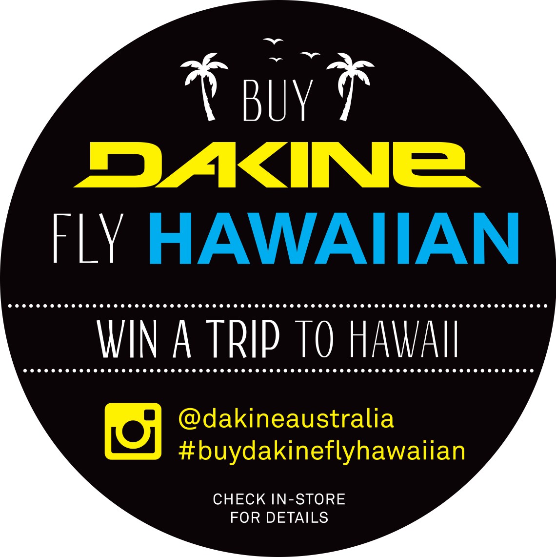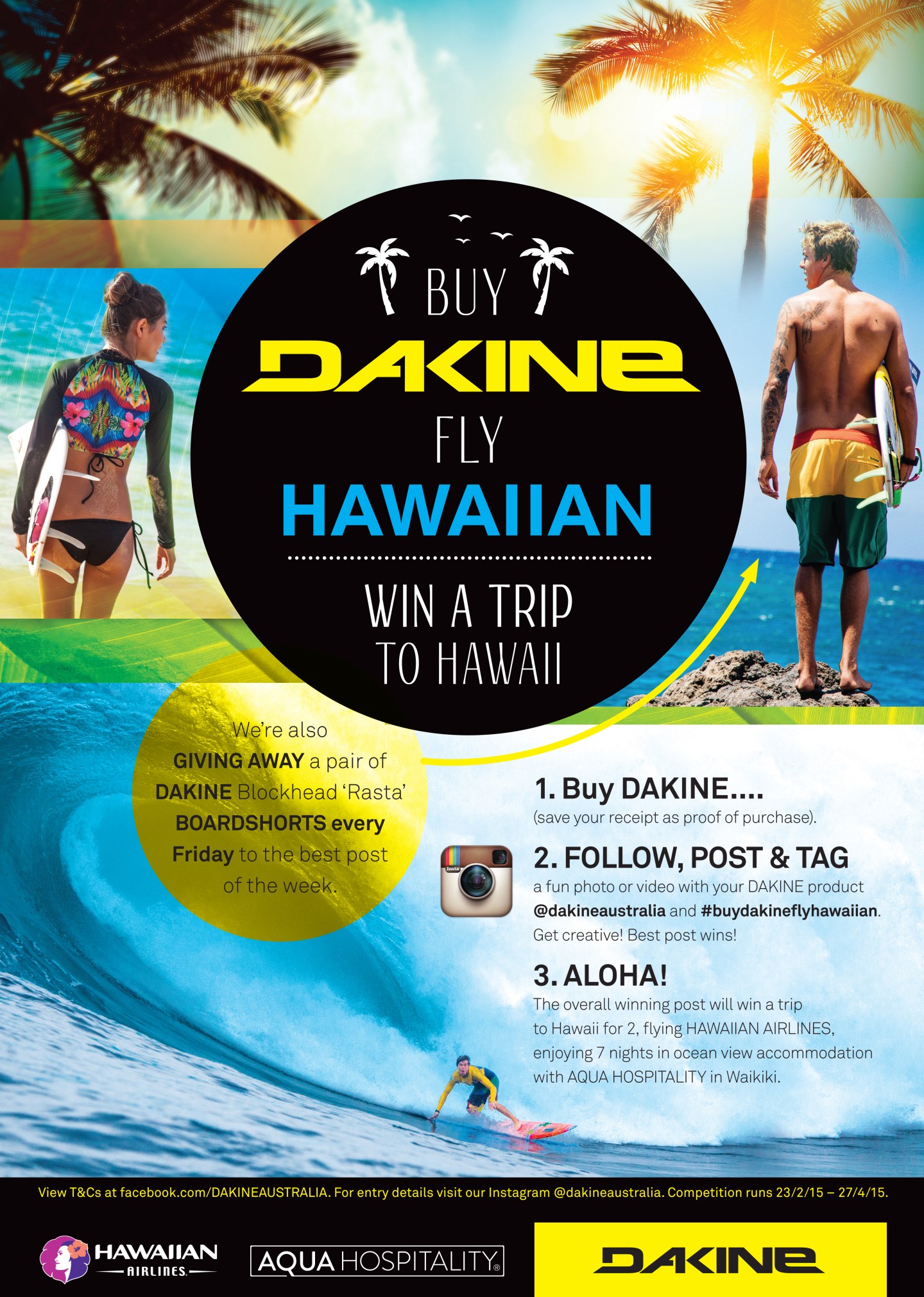 In-Store Collateral focused on current Dakine designs and included posters, window decals and high profile swing tags to drive customer sales and entries. Social Media supported the program with Instagram & Facebook posts. Magazine Ads in core surf magazines and online sites also drove store visits and competition entries.