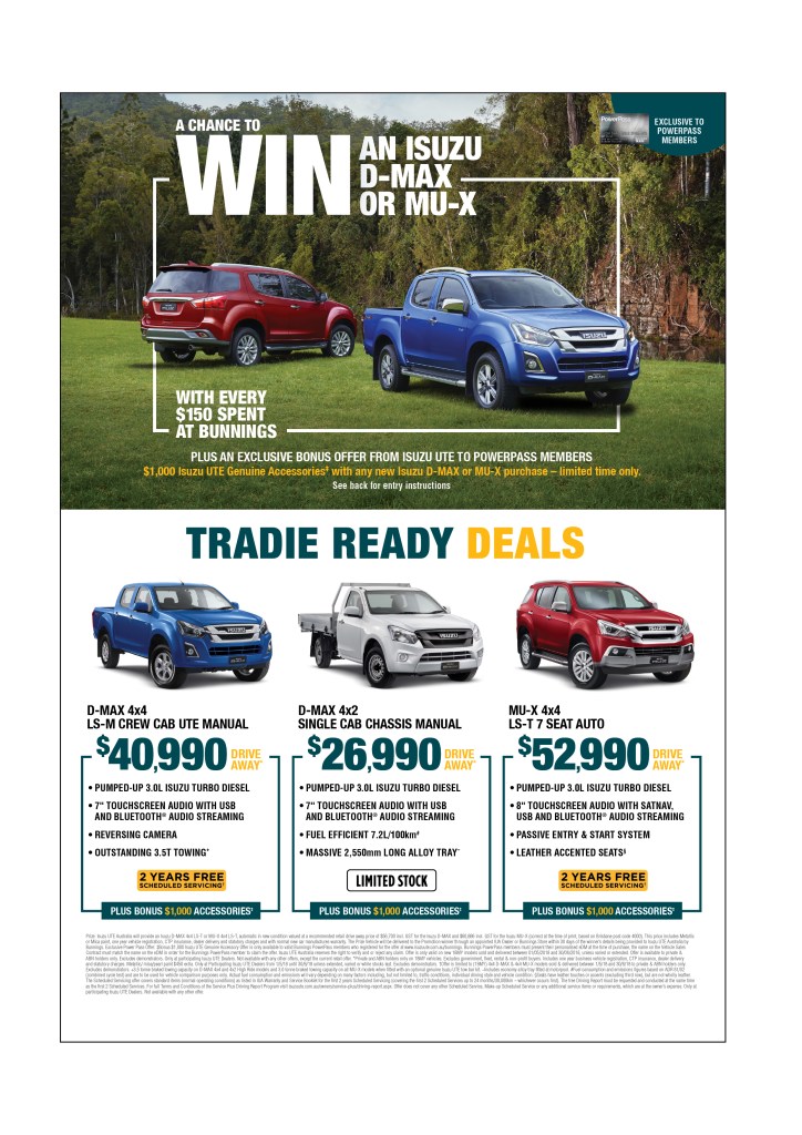 This Bunnings PowerPass promotion gave Trade Account and PowerPass members the opportunity to win their choice of Isuzu D-Max Ute or MU-X Wagon.