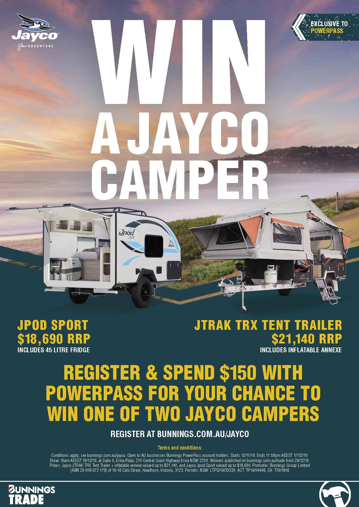 Bunnings PowerPass members can also take advantage of Jayco exclusive offers with bonus factory fitted options exclusive to PowerPass Card Holders available on Jayco Camper Trailers, Pop Tops, Caravans and Motorhomes.