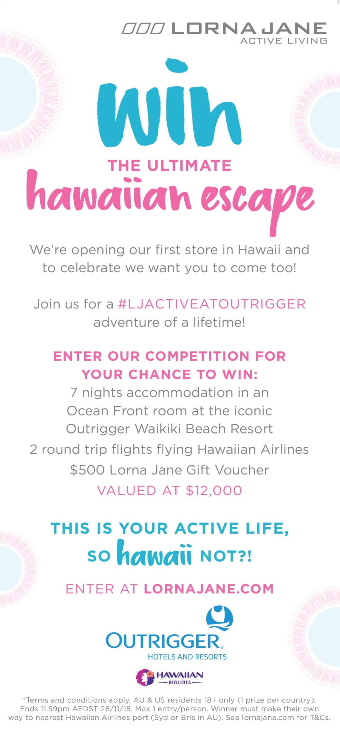 Lorna Jane were opening their first store in Hawaii. As part of the celebration we developed two international prizes for a Winner and friend to go to Hawaii too, staying in an ocean front room at Outrigger Waikiki Beach Resort for 7 nights, and flying Hawaiian Airlines, including a $500 Lorna Jane Gift Voucher to spend.